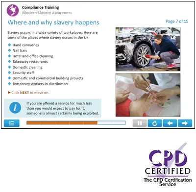 This Modern Slavery Awareness online training course explains forms of slavery, and identifies which countries and industries are vulnerable to slavery. It covers what companies should do about slavery and identifies steps people can take to help combat slavery. The course also outlines anti-slavery laws in the UK including the Modern Slavery Act 2015.